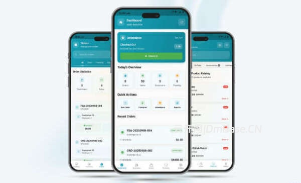 提供强大的后端仪表板,实时显示活跃员工、客户指标、总订单数和待处理审批等关键业务数据。移动应用仪表板提供 streamlined 用户登录和今日订单、销售额、订单价值等快速视图。